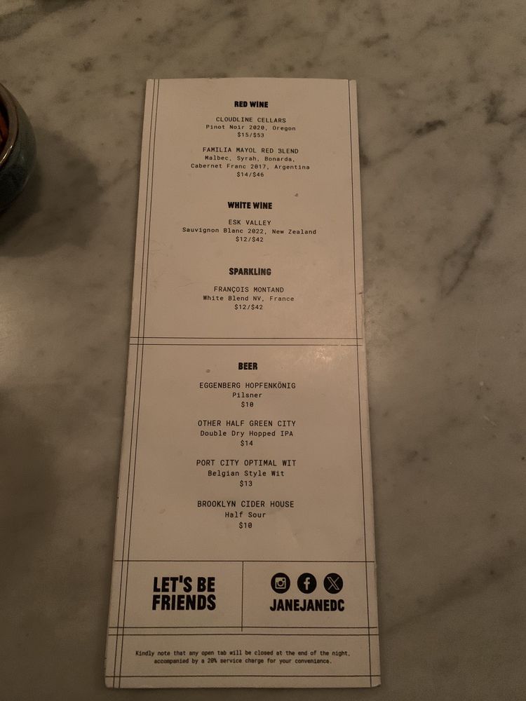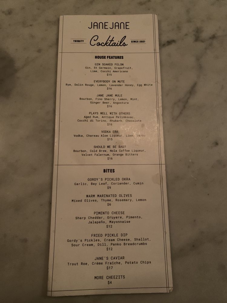 Jane Jane is a trendy cocktail bar located in Washington, DC. With a cozy and inviting ambiance, it offers a unique experience for patrons looking for well-crafted cocktails. The menu features a variety of creative drinks, like the Anita Bryant and Hole in a Cup cocktails, as well as classics like the Lions Tail and Earl Grey Martini. Customers rave about the attentive service and the complimentary snacks, such as Cheez-its, adding a millennial touch to the chic decor. The gender-neutral restrooms and gender-friendliness make Jane Jane a welcoming space for all. Customers also appreciate the option for outdoor seating during warmer months. With a full bar, pool table, and happy hour specials, Jane Jane is a must-visit destination for those looking for a memorable night out in the bustling city.